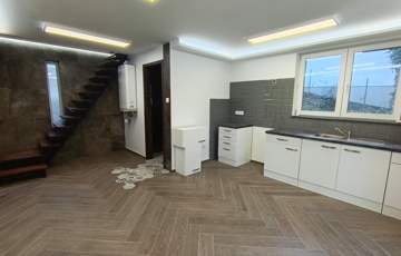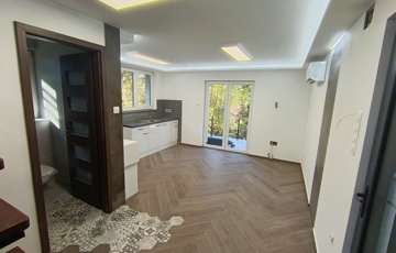 minőségi burkolatok, beépített konyhabútor és elegáns, zuhanyzós fürdőszoba található.