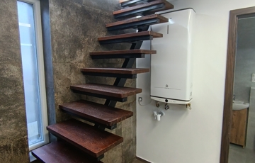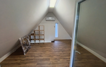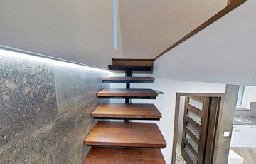A földszinten konyhával egybenyitott nappali és fürdőszoba kapott helyet, az emeleten
