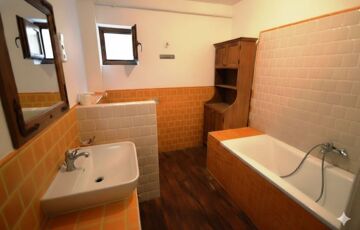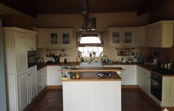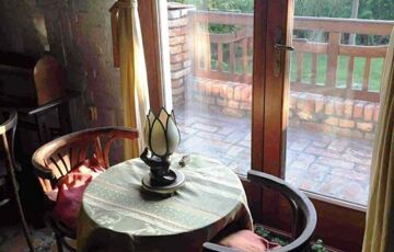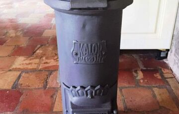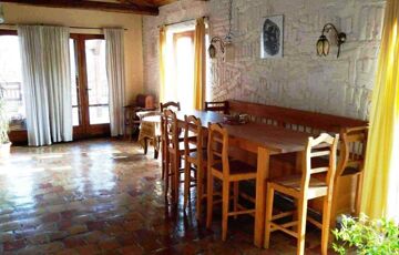 A nappali-konyha központjában álló öntöttvas-kályha melegséget és rusztikus eleganciát sugároz, kiegészítve a helyiségeket borító rusztikus kő padló burkolattal.