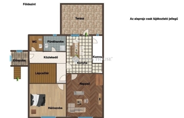 Helyiségek elosztása: Földszint: Előszoba Külön WC Felújított fürdőszoba épített zuhanyzóval Konyha kamrával, kijárat a hátsó teraszos kertbe Nappali cserépkályhával, két helyiségből is megközelíthető Hálószoba