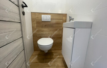 A fürdőszobában új Geberit WC, fürdőkád, valamint mosógép- és szárítógép csatlakozás került kialakításra. A dupla mosdókagyló beépítése is megoldható. A különálló mellékhelyiség szintén új Geberit WC-vel és kézmosóval felszerelt.