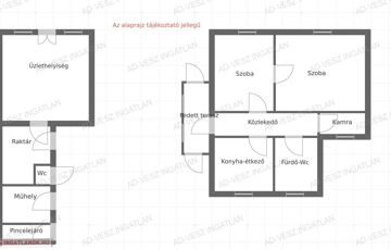 A 382m2-es összközműves telken a lakóházon kívül még egy üzlehelyiség, raktár, wc, műhely, és pince is helyet kapott.