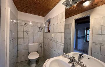 A kétszintes ház jelenlegi elosztása 3 szobából, konyhából, étkezőből és fürdőszobából áll! A földszinti részen található 1 szoba, konyha, étkező és a fürdőszoba. Az emeleten pedig a másik 2 szoba.