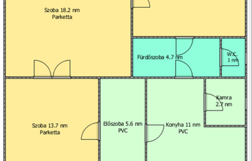 Helyiségei: 2 szoba, 1 félszoba, előszoba, fürdőszoba, külön nyíló W.C., konyha, kamra, fedett terasz.