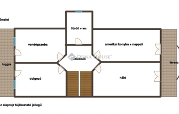 Emelet: amerikai konyhás nappali, 3 külön nyíló hálószoba, fürdőszoba, loggia.