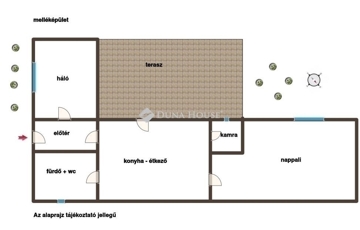 2 szoba, konyha-étkező, kamra, fürdőszoba, valamint egy 20 m²-es terasz.