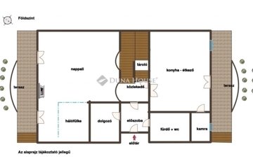 Földszint: tágas, világos nappali kandallóval, étkezős konyha, kamra, szoba, hálófülke, fürdőszoba, tároló, valamint két fedett terasz.