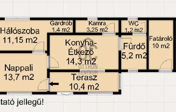 - helyiségek: 2 tágas hálószoba, 1 nappali, konyha-étkező, fürdő, külön WC, gardrób, kamra, tágas terasz