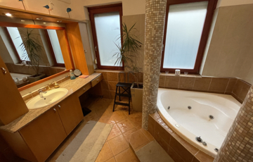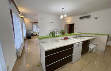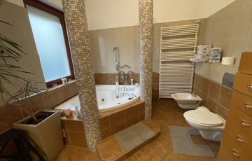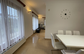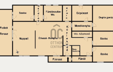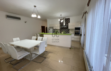 Helyiségei: hatalmas, világos, hangulatos konyha-étkező-nappali, 3 különnyíló szoba, 2 fürdőszoba (zuhanyzós és kádas), 2 wc, kamra, mosókonyha, gépészet, gardrób, dupla garázs.