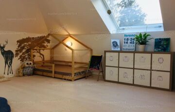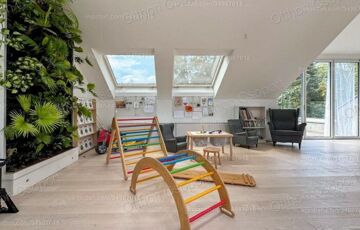 - Egy légterű, amerikai konyhás nappali, gyerek- és, szülőisarokkal (130 m²).