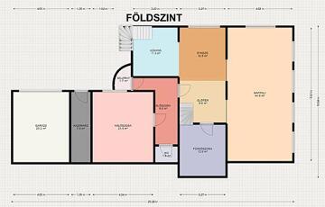 Földszint: 116 m²-en amerikai konyhás nappali, 1 hálószoba, fürdőszoba mellékhelyiséggel, kamra és előtér található.