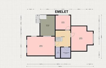 Emelet: 116 m²-en 3 hálószoba, 20 m²-es terasz, fürdőszoba, külön mellékhelyiség és előtér található.