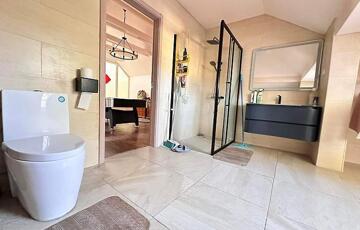 Modern fűtés és biztonság: A ház fűtését kondenzációs kazán biztosítja, a biztonságot pedig kamera és riasztó rendszer garantálja. A fürdőszobák 2019-ben teljes körű felújításon estek át, új burkolatokkal, kádakkal, zuhanyzókkal és szaniterekkel.