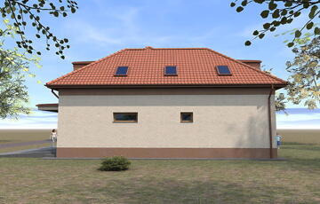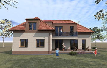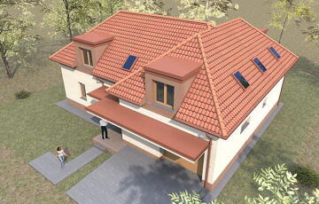A ház kialakítása: a földszinten egy hálószoba, az emeleten négy további hálószoba, három fürdőszoba és külön WC kap helyet. A nappali, a konyha és az étkező tágas egybefüggő teret alkot. A nappaliból nyílik egy 25 m2-es terasz is. A fűtés, hűtés hőszivattyúval megoldott. A praktikumot a garázs és a külön tároló tovább növeli. 3x25 A elektromos kapacitás normál és H tarifával biztosítja a költséghatékony üzemeltetést. A burkolatok, belső ajtók, szaniterek és a térkövek választhatóak.