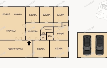 Kültéri lehetőségek: 16 m2-es fedett terasz, 30 m2-es dupla garázs + gépkocsi beálló.