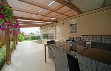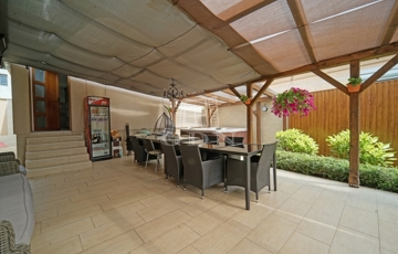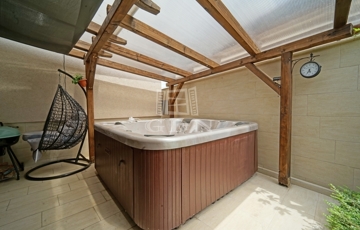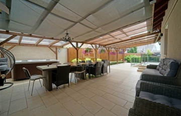 A parkosított kertet öntözőrendszer locsolja helyettünk. A megközelítőleg 70m2-es fedett terasz kiválló helyszíne a családi összejöveteleknek és a pihenésnek. Az itt található jacuzzi is a vételár részét képezi.