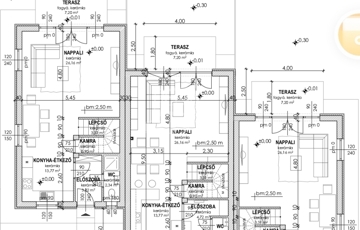 Földszinten, 50 nm nagyságú területen egy nagy méretű amerikai konyhás nappali, előszoba, kamra, mosdó. A földszintet egy terasz egészíti ki.