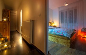 Az alsó szinten egy külön bejáratú lakrész található szobával, fürdőszobával és egy kis konyhával – tökéletes vendégeknek, vagy akár önálló apartmanként is hasznosítható.