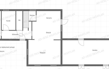 A ház földszintjén tágas, világos nappali, konyha étkezővel, egy hálószoba, wc, fürdő, kamra, előszoba, és közlekedő lett kialakítva.