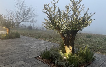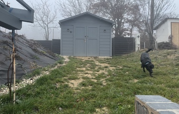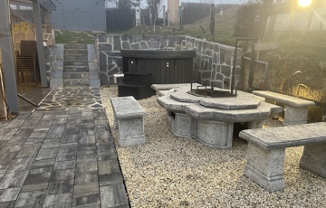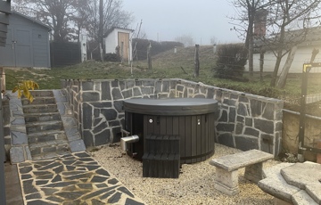 A ház mellett kialakított exkluzív kerti pihenőtér a nyári esték tökéletes helyszíne: fedett terasz, fatüzelésű dézsa jakuzzi funkcióval, valamint hangulatos Jován XXL tűzrakóhely szolgálja a kikapcsolódást. A kertben egy 9 m²-es szerszámos ház is helyet kapott.