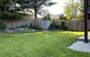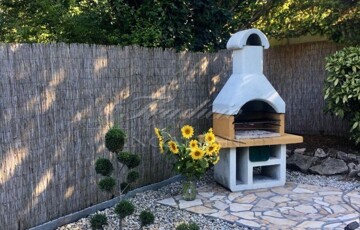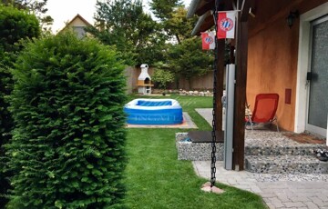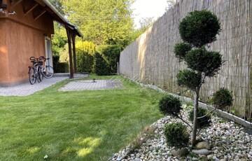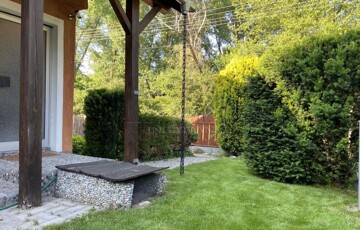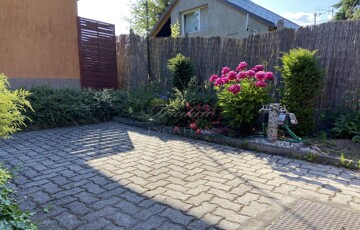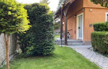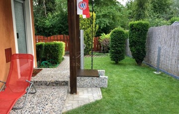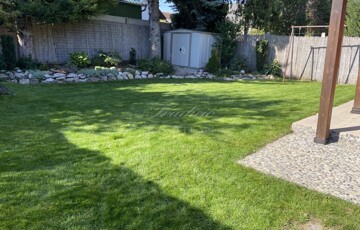 A gyönyörűen karbantartott, parkosított 311 m2-es, 40-50 éves fákkal, virágokkal, vakondhálóval, automata öntözőrendszerrel, robotfűnyíróval rendelkező telken a ház mellett egy 6 m2-es kerti tároló, grillező, valamint egy térkövezett rész is helyet kapott, ami ideális medence, vagy jakuzzi elhelyezése. A térkövezett gépkocsibeálló az előkertben található.