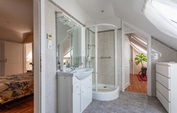 A házhoz tartozik egy 70 m²-es, különálló duplagarázs padlástérrel, automata kapukkal.