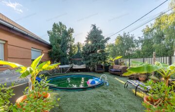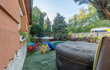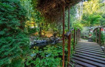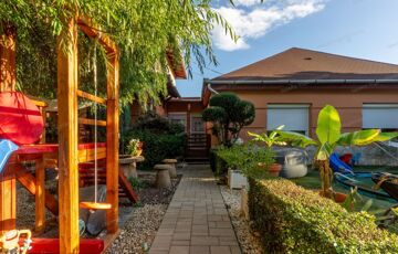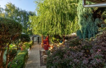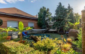 A parkosított, arborétum jellegű kert különleges atmoszférát teremt: saját halastó híddal, gondozott növényállomány, szalonnasütő és hangulatos pihenőrészek szolgálják a kikapcsolódást. Az ingatlan alatt pince is található.