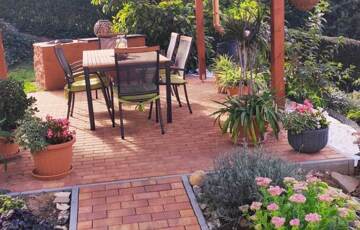 A 1 200 m²-es parkosított telek dísznövényekkel, virágokkal beültetett.