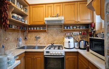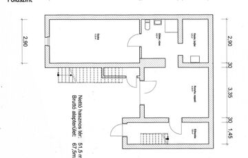 FÖLDSZINT ( 51,5 m2) helyiségei: 14,39 m2 Konyha-nappali, 6,82 m2 fürdőszoba, egy 17,26 m2-es szoba, 5,05 m2 kazánház. A földszintről a lakáson belülről egy előszobából is vezet lépcső az emeletre.