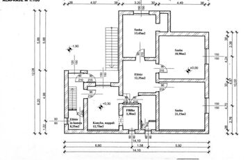 EMELET helyiségei (90,23 m2) : 4 szoba ( 13,45 m2, 12,35 m2, 21,15 m2, 12,75 m2) fürdőszoba, előszoba 12,35, konyha 3,38, előszoba 8,25 m2, előtér 8,25 m2, dolgozó szoba.