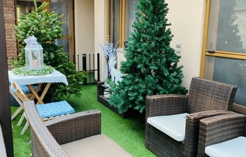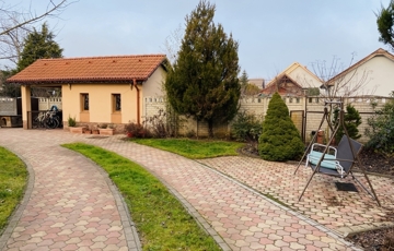 Az 1049 m²-es kert egy kész botanikus kert: gyönyörű növényzet, viacolor burkolat, automata öntözőrendszer (fúrt kútról).