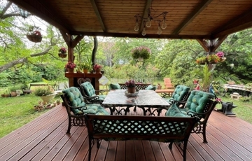 A nappali előtt egy 26 m²-es, rusztikus, 100 éves gerendákból készült fedett terasz, amely egy intim, gondozott kertre és grillezőre nyílik. Konyha előtti 14 m²-es terasz működő kemencével és sparherddel – tökéletes helyszín a kültéri sütés-főzés szerelmeseinek.