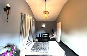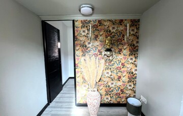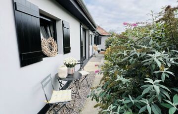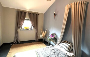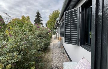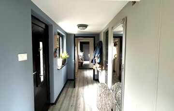 Az ingatlan jellemzői: A főbejáraton át egy világos közlekedőbe érkezünk, ahonnan minden helyiség könnyen megközelíthető. Innen jutunk el a fényes, jelenleg olvasótérként használt előszobába, amelyből nyílik a modern, gépesített konyha étkezővel, valamint az egyik barátságos hálószoba. A közlekedő másik irányába található a zuhanyzós fürdőszoba WC-vel, egy külön helyiség, amelyet most mosókonyhaként használnak, továbbá a nagy belmagasságú, rendkívül világos nappali, amely a ház központi tere. Innen közelíthető meg a másik, tágas és kényelmes hálószoba is. A fa nyílászárók tovább erősítik a ház természetes, otthonos hangulatát.
