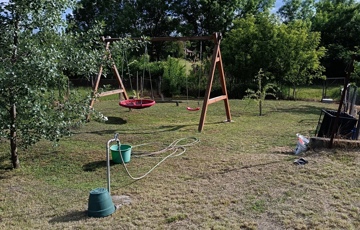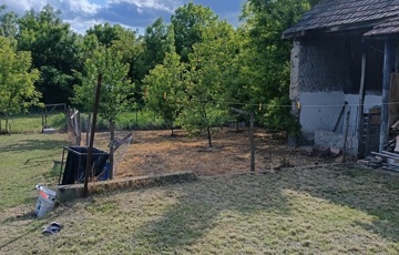 A kertben van egy kis ház és állattartásra alkalmas helyiségek. Kerti csap, csatornarendszer.