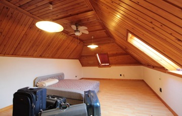 Masszív tölgyfa lépcső vezet az emeleti galériába, ahol egyedi könyvespolcok mellett haladva három szoba, mosókonyha és egy további fürdőszoba (kád, tusoló, WC) található.
