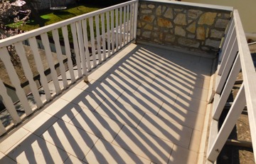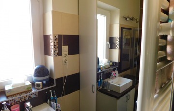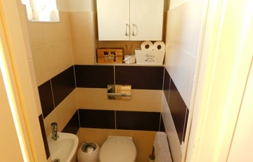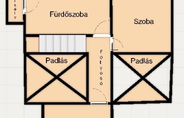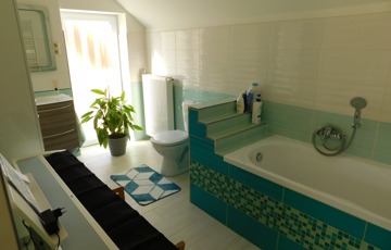 A tetőtérbe az előszobából egy felújított mahagóni falépcsőn jutunk fel. Itt kapott helyet egy fürdőszoba, melynek erkélyéről gyönyörű kilátás nyílik a Tamás-hegyre. A fürdő padlózata programozható elektromos fűtéssel van ellátva, és a meleg vizet egy külön 80 literes villanybojler biztosítja.