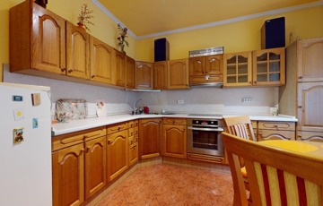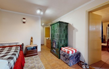 A földszinten valamikor a garázs került megépítésre, itt azonban az évek alatt egy szoba, konyha, fürdőszoba (gyakorlatilag egy különálló lakrész) került kialakításra. Innen pár lépcsőn jutunk a földszintre, amely konyha és étkező helyiségekből áll. Ide egyébként oldalsó fő bejárattal tudunk bejutni, és itt is kialakításra került egy WC, kézmosó.