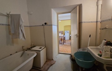 A tágas konyhából nyílik a fürdőszoba WC-vel, onnan egy tároló és a kazánház. A tárolóból juthatunk fel a padlásra.