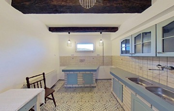 Fontos szempont volt a felújításnál az épület hagyományos stílusjegyeinek a megőrzése, így köszön vissza a múlt egy darabkája a rusztikus terméskő falazat és a pácolt nagyméretű fa gerendák formájában.