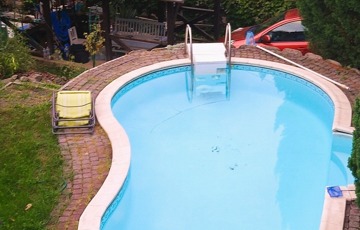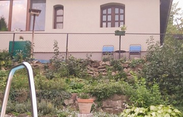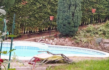 Az udvaron hangulatos, megvilágítható „fóliázott” (nem csempés) medence, fedett autóbeálló, tűzrakóhely, sziklakert, ősfák és dísznövények találhatók.