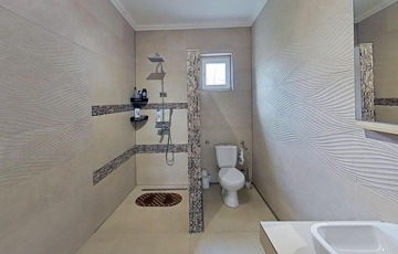 Az utcafrontról jutunk be az épületbe egy fedett 14 m2-es előtéren keresztül. A központi részben egy tágas előtér-étkező és nappali található. Innen nyílik az utca felé egy hálószoba és egy hozzá tartozó fürdő, valamint egy hátsó épületrész is, amely 2 hálószobát és további egy fürdőszobát foglal magába. A nappali és a hálók között egy háztartási helyiség és egy kamra is praktikusan helyett kapott. A keresztirányú épületrész a konyhát tartalmazza, ahonnan további 35 m2-es terasz nyílik az oldalkert irányába. A szobák méreteiről, belső elosztásukról a hirdetéshez mellékelt virtuális séta ikonra kattintva kaphat teljes képet.