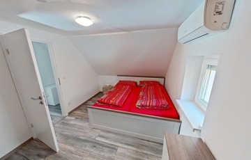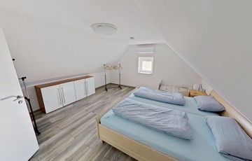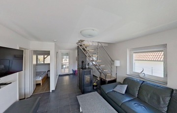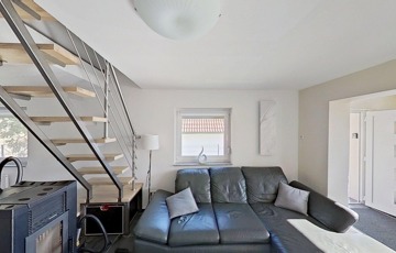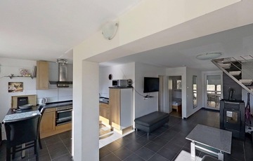 A földszinten a nagy, egy légterű nappali / konyha / étkező mellett fürdő / wc és egy kisebb hálószoba található, míg az emeleten két további hálószoba van.
