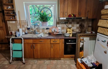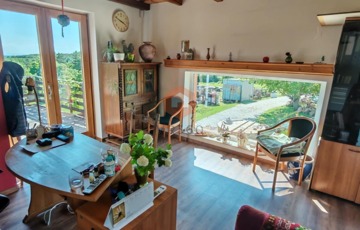 A házban mindkét szinten található konyhai rész, az alsó szint alatt, csodás hangulatú borospince tárul elénk.