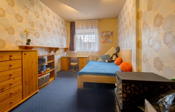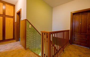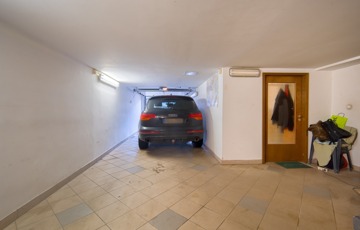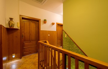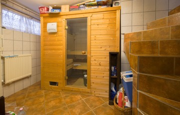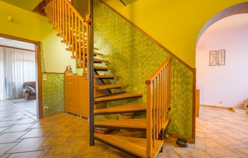 A pinceszinten nagy tároló, két állásos garázs, szauna és háztartási helyiség található, valamint a kertbe közvetlen kijárás is megoldott. A földszinten konyha, étkező/szoba, hatalmas nappali és 21 m2-es, kertkapcsolatos terasz, zuhanyzós fürdő-WC, valamint kamra, az emeleten további 4 hálószoba és egy sarokkádas fürdőszoba található.