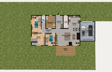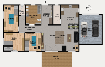 A 736 m²-es telken elhelyezkedő ingatlanban 3 hálószoba, amerikai konyhás nappali, fürdőszoba, vendégmosdó és egy spejz kapott helyet.