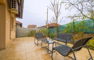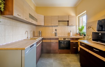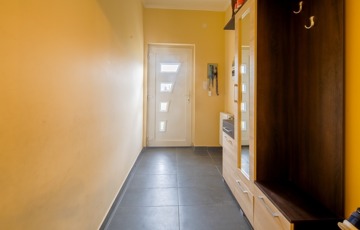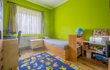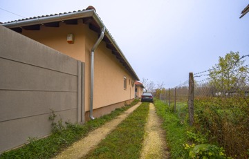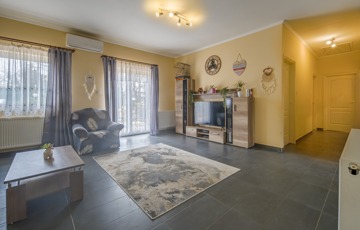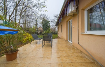 Az ingatlan a 22 m²-es garázson keresztül kapcsolódik a szomszédos épülethez. A nagyméretű teraszra a nappaliból lehet kilépni, és a telek elrendezésének köszönhetően az ingatlan szinte teljesen körbejárható.