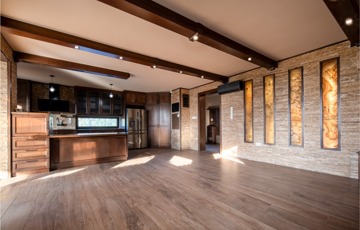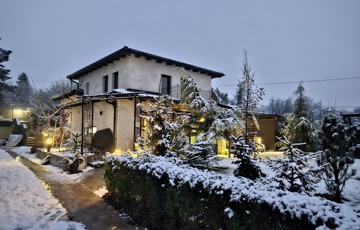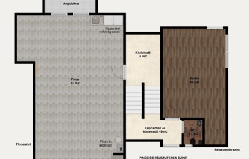 Monolit vasbeton szerkezet, 44 centis Porotherm tégla + hőszigetelő vakolat, az emelet 43, a földszint a félemeleti szobával és fürdővel 122, a pince a vendégszobával 56, a nappaliterasz 40 m2.