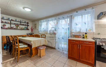 Tágas konyha–étkező, ahonnan közvetlen kijárat nyílik a kertbe, előszoba, kamra és gardrób.