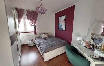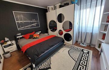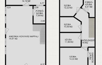 Az ingatlan belső 2 szintes, a földszinten egy hatalmas amerikai konyhás nappali és fürdőszoba található, az emeleten 4 szoba (egyik szoba gardróbbal is rendelkezik), fürdőszoba, közlekedő és erkély került kialakításra. A szobák laminált parkettásak, a többi helyiség járólapos.