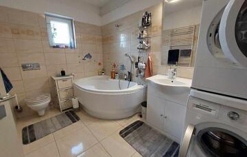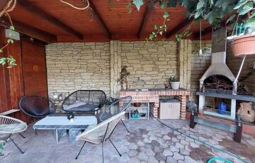 A fűtést padlófűtés és kombi cirkó biztosítja, és hűtő-fűtő klíma is rendelkezésre áll. A kertre néző teraszt a nappaliból lehet megközelíteni. Tartozik a házhoz garázs, fedett autóbeálló és a telek végében kerti sütögető hely is kialakításre került.